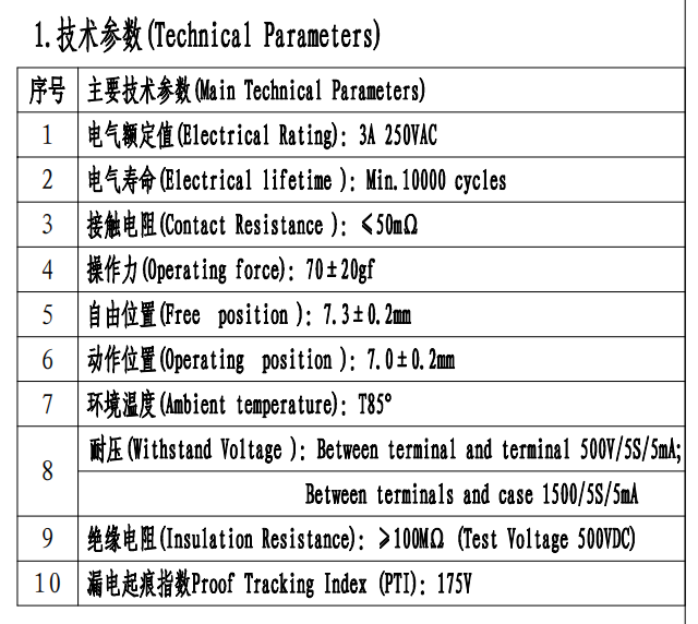 | 8 | ทนต่อแรงดันไฟฟ้า: ระหว่างเทอร์มินัลและเทอร์มินัล 500V/5S/5mA; |